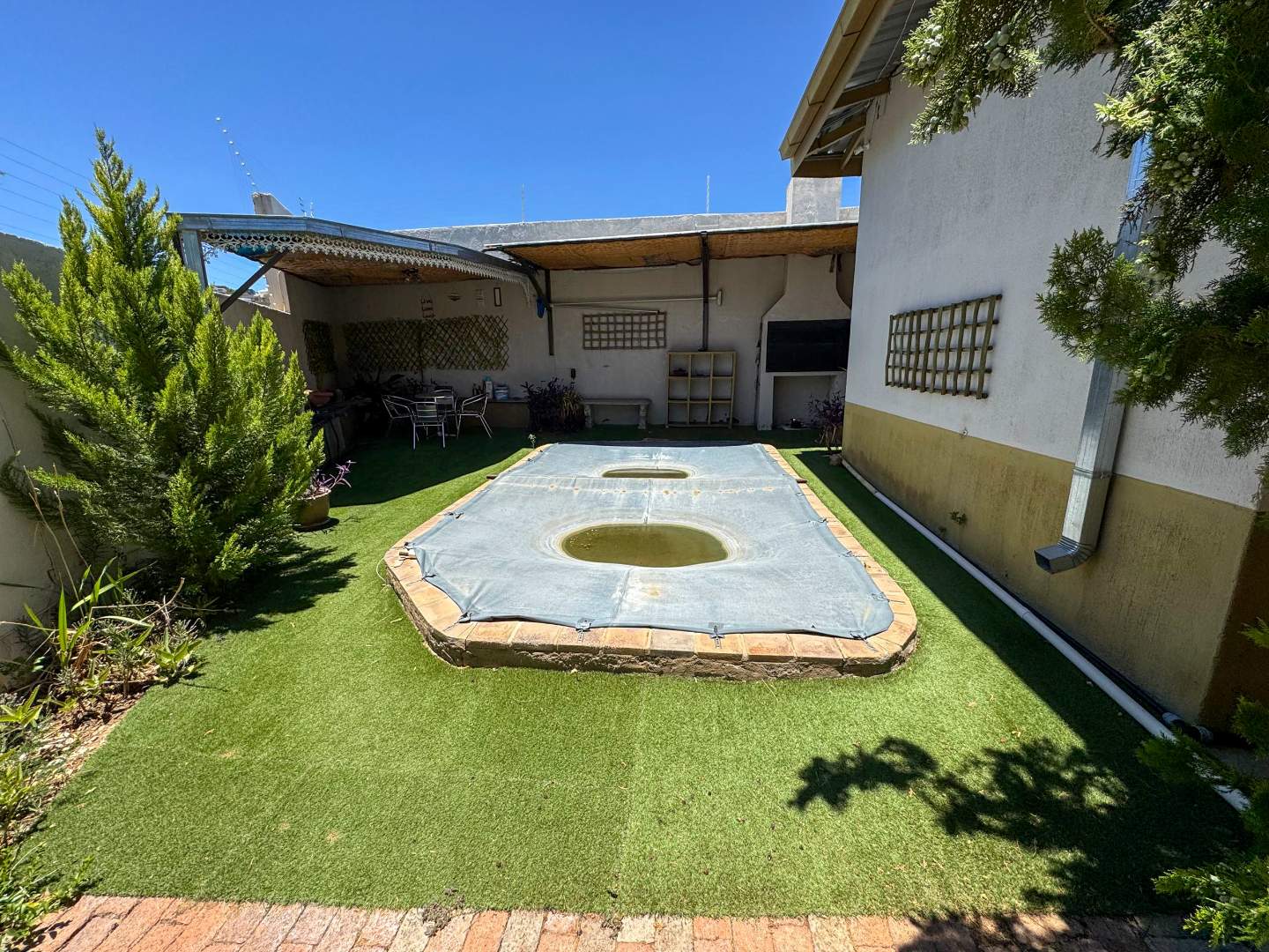 -Swimming pool with a shaded patio and braai